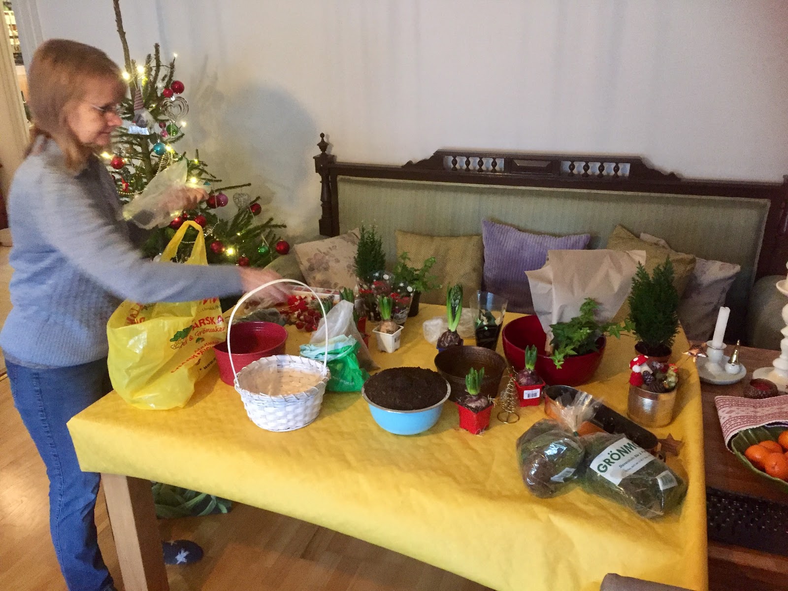 Sen i lördags skulle mamma, jag, Pernilla och tjejerna ses hemma hos mig och göra julgrupper tillsammans men Greta fick feber och var extra kinkig och mammig så de stannade hemma. Mamma och jag sågs ändå och åkte först till Blomsterlandet och köpte blommor till våra grupper. Sen åkte vi hem och åt julskinksmackor och drack lite glögg innan vi började med julgrupperna. Det är så mysigt att julpyssla så här. Jag hoppas detta blir en framtida tradition.